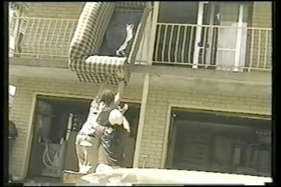 Two men lower a bookshelf from an apartment balcony with a zip line, but it falls off the balcony and breaks when it hits the ground. Short tail