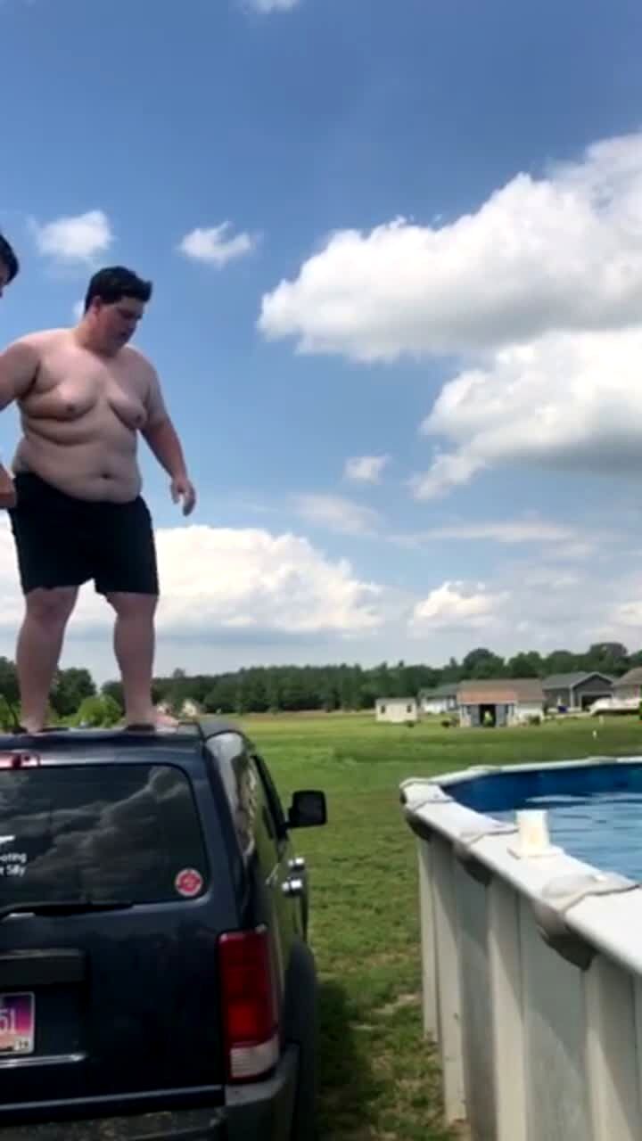 A man stands on the top of a car and tries to jump into a swimming pool, but slips and lands on his groin on the side of the pool and then falls into the water.