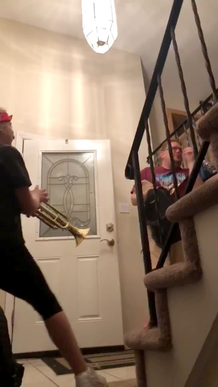 A young girl blows her trumpet at her dad as he enters the house. The man grips his heart and yells "Jesus Christ."