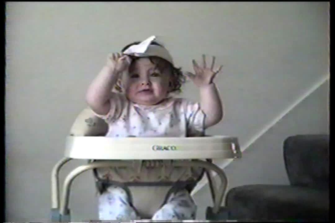 Man tries to put headband / bow on baby girl's head. She pulls it down over her eyes & can't see. She flails around. Blindfolded.