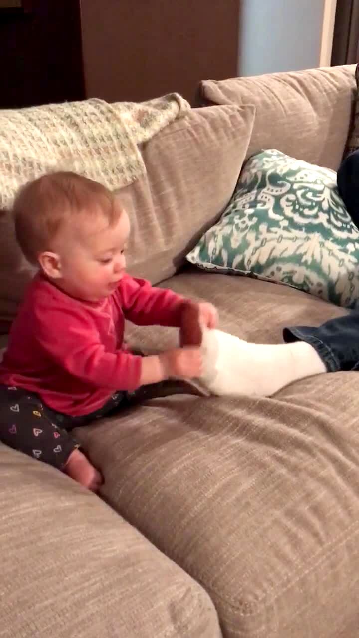 A baby girl sucks on a man's foot in the living room while he wears a sock. He pulls his foot away and then puts a barefoot in front of her and she gets scared and starts to cry.