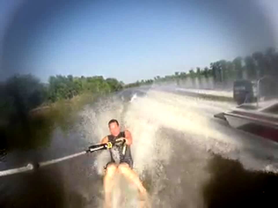 A woman hangs on a pole on the side of a speed boat on a lake outdoors, skims the water on her bare feet, waves to the camera, and falls in.