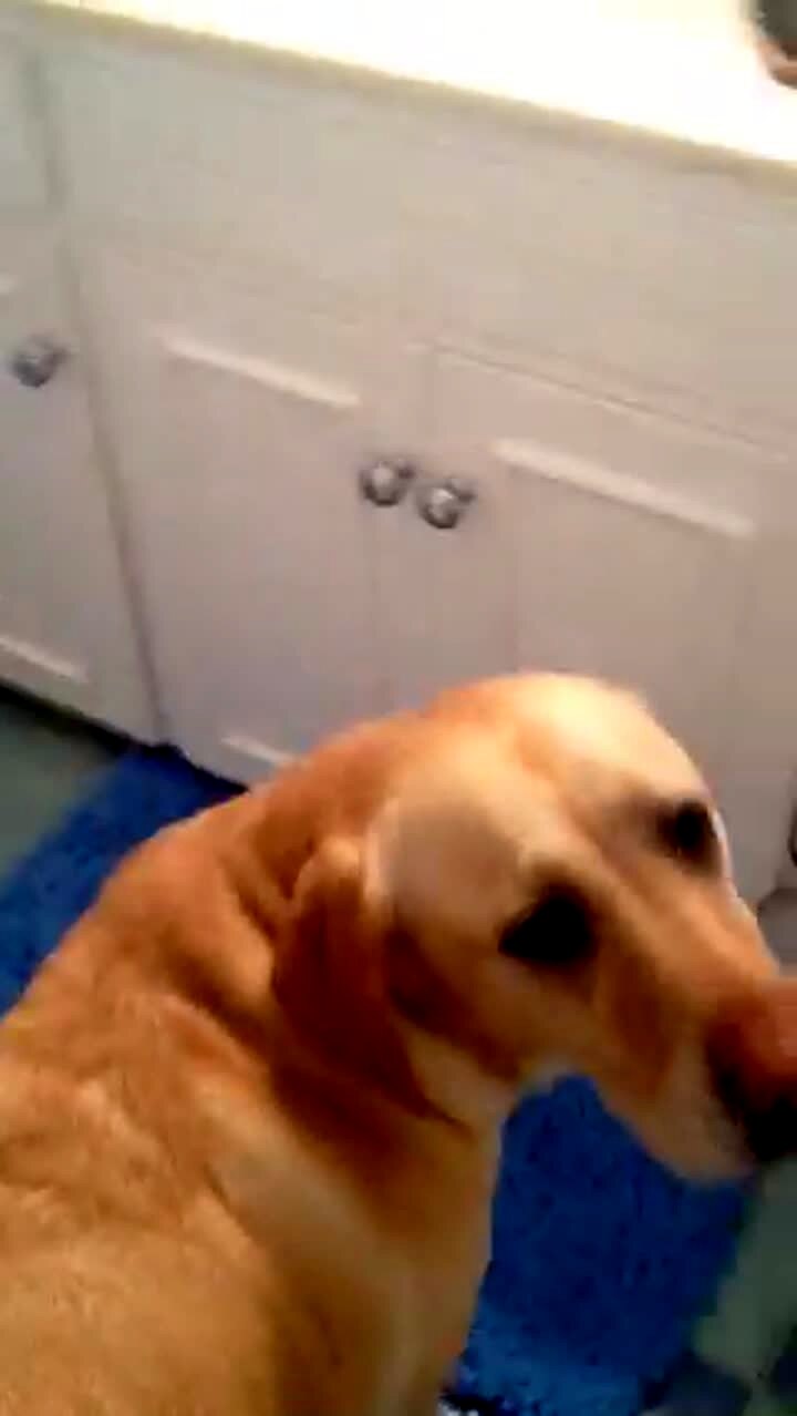 A mom catches her tot boy after he sprays foam soap in a bathroom and on their Chocolate Labrador dog and he says he didn't mean to do it. She says she has to tell his dad and he gets upset.