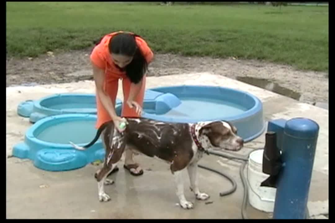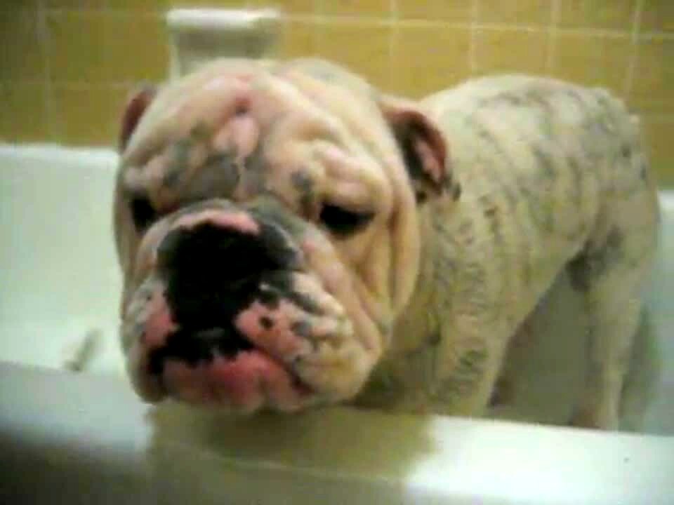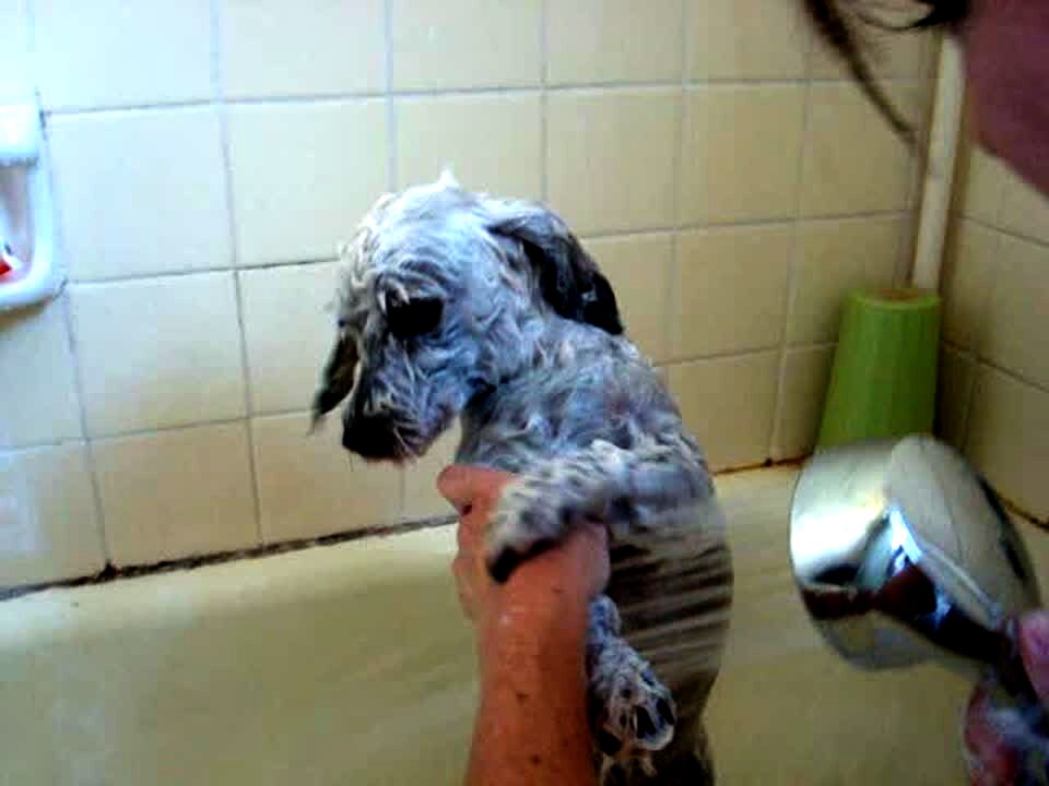 Strange hairless dog gets a bath and makes weird noises while shaking.