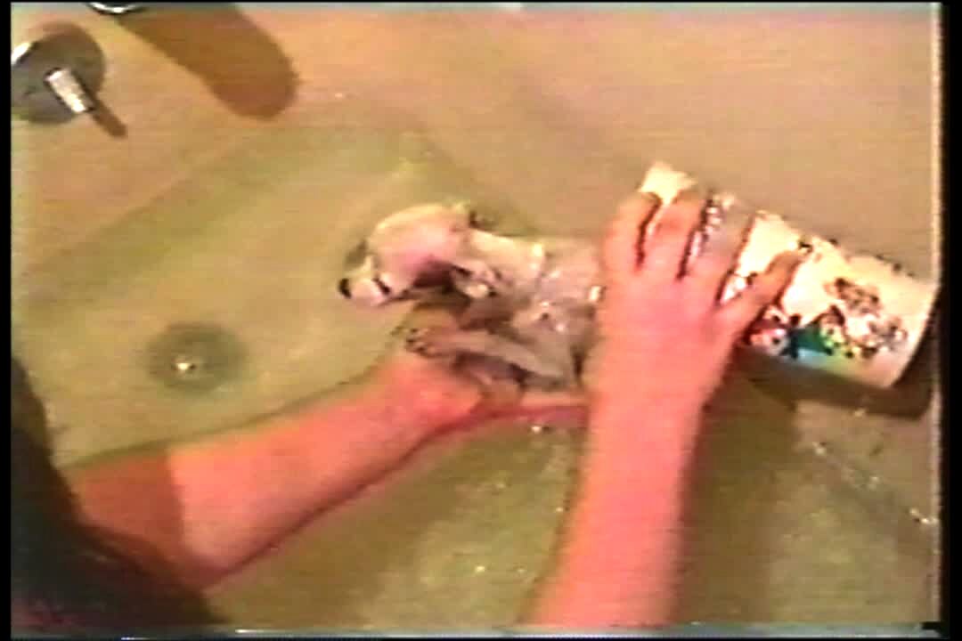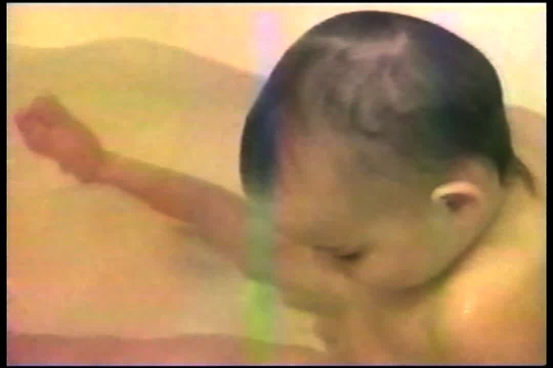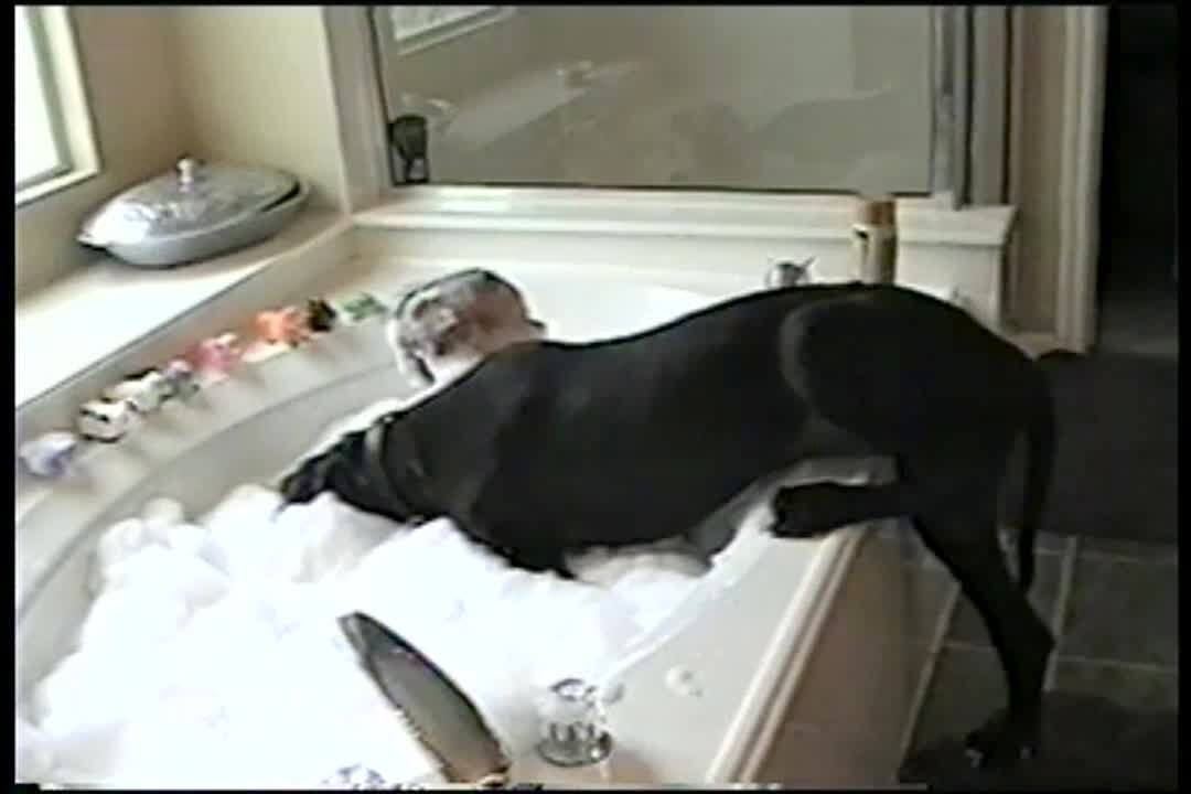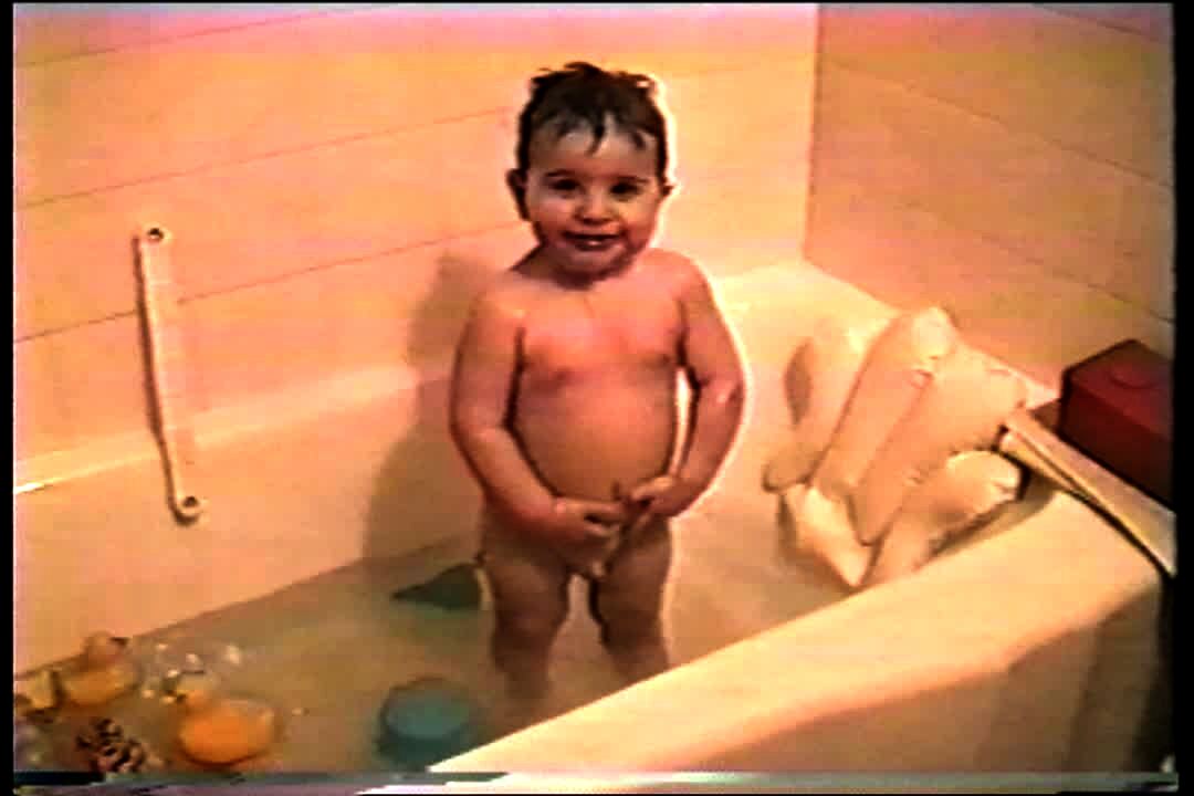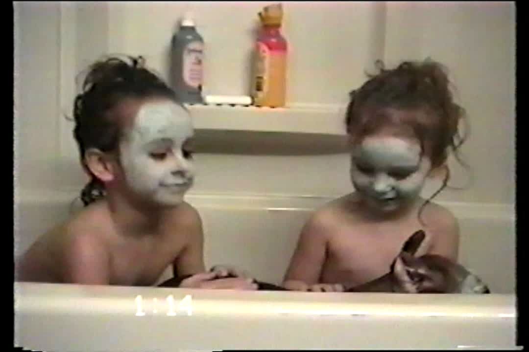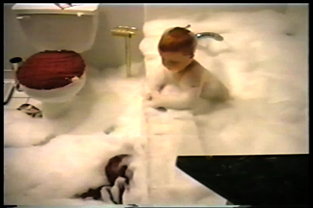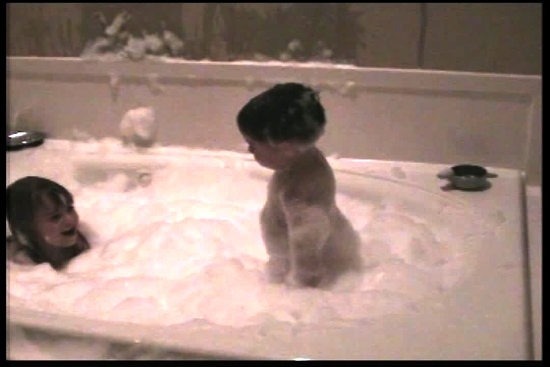 Little girl & tot boy are covered in bubbles in bath tub. Boy slips / falls under & disappears, then stands up opening his mouth wide. Short tail.