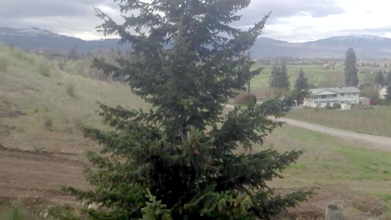 A woman in a hot air balloon records as they crash into pine tree while landing at :29.