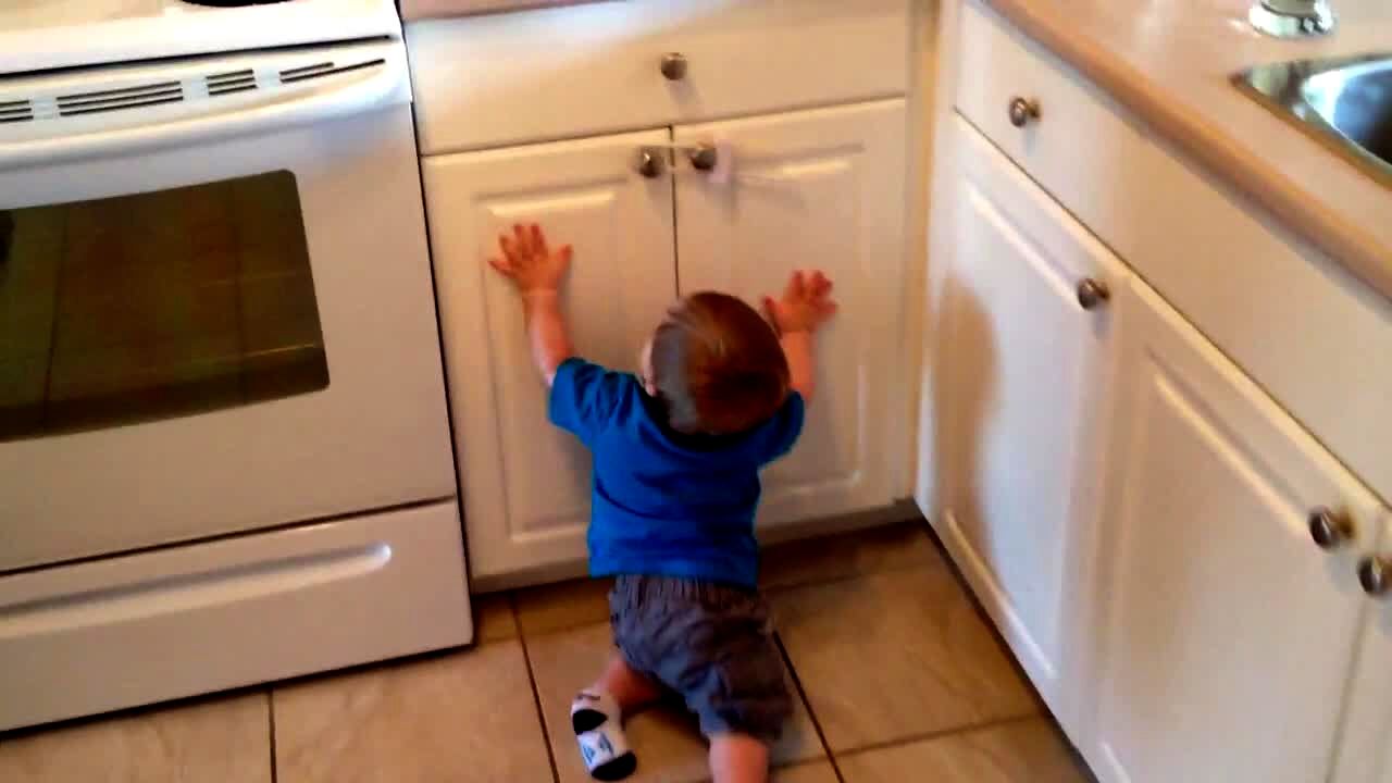 10 month old baby boy removes child proof lock from cupboard and shows it to camera.