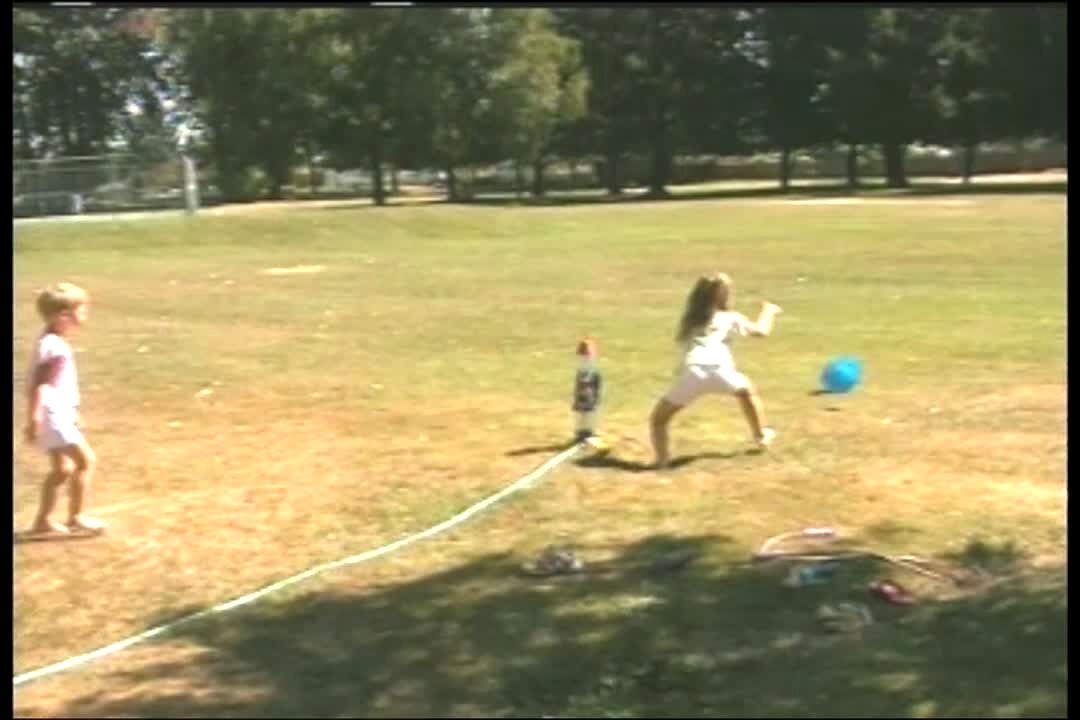 Young girl stands next to water rocket when it's being launched. She puts a helmet on & the rocket hits her in the head.