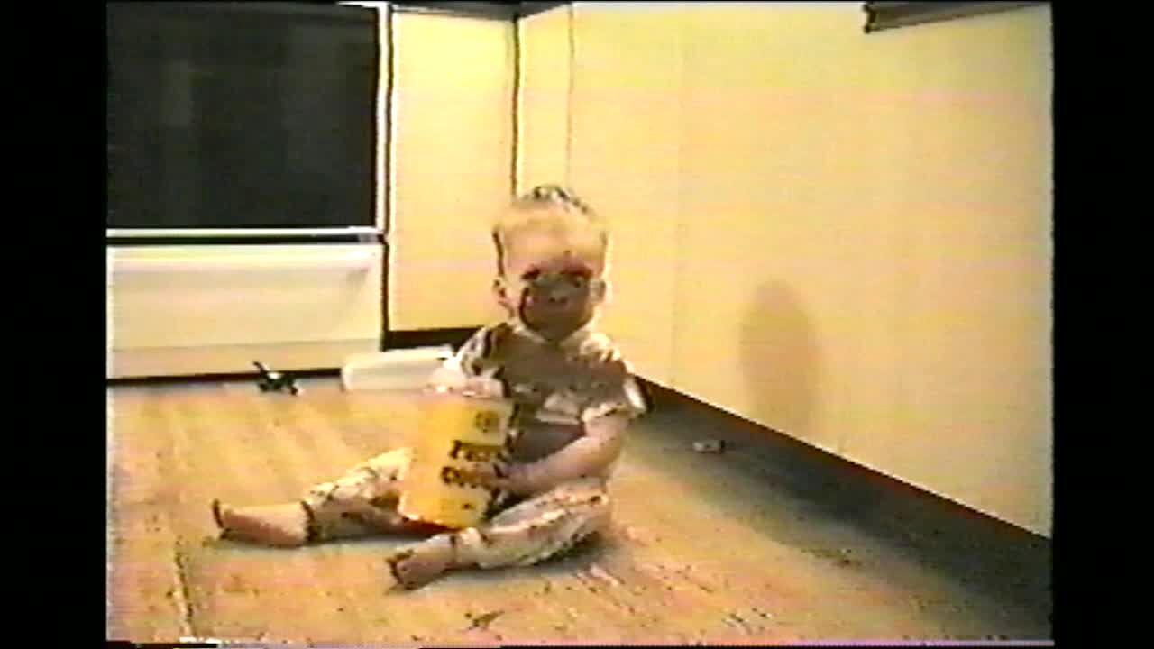 Blindfolded tot boy at birthday party goes to "pin tail on donkey," walks into wall.
