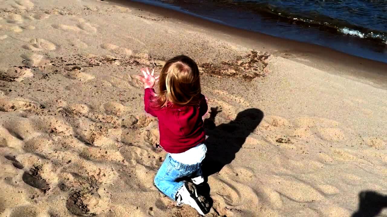 A young girl and two young boys all fall when they run out of the ocean. Featured talent cleared only (the three children who fall in the water)