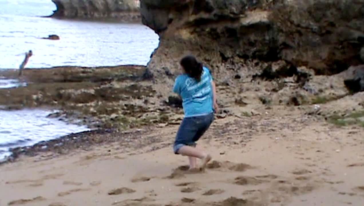 Girl on beach sees something on sand, touches it, says, "It was poop." (2103)