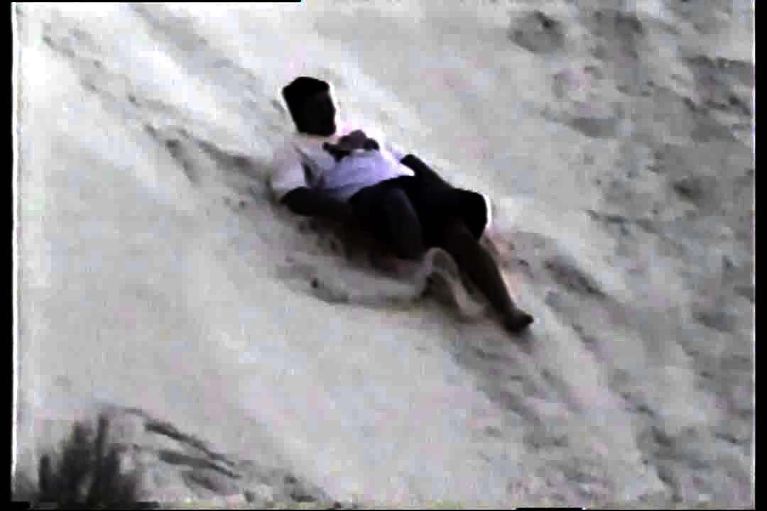 Teen on sled at sand dunes, goes down hill and crashes into cactus.