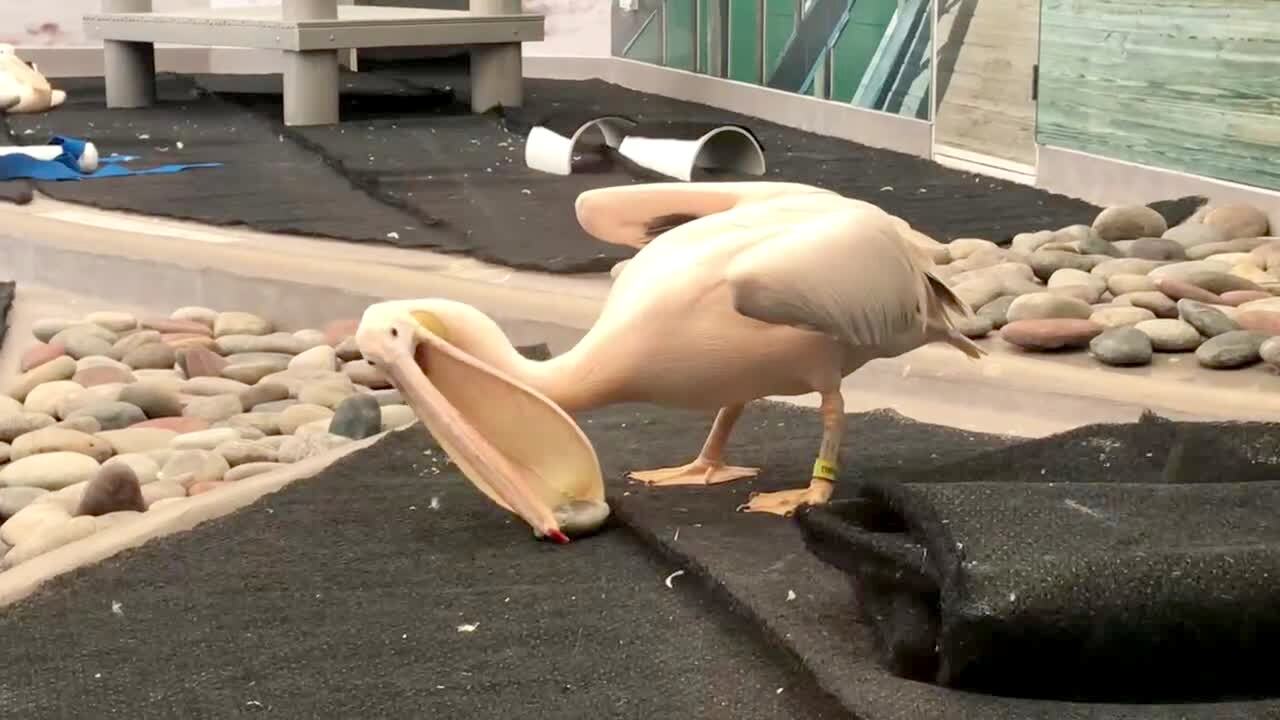 A pelican tries to pick up a rock but cannot angle its head properly, and another bird watches.