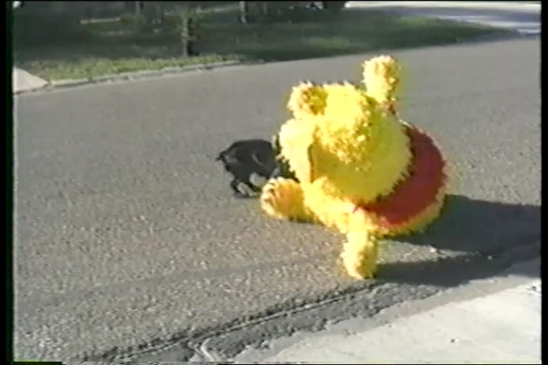 Small dog drags large Winnie the Pooh pi�ata down street as people chase him.