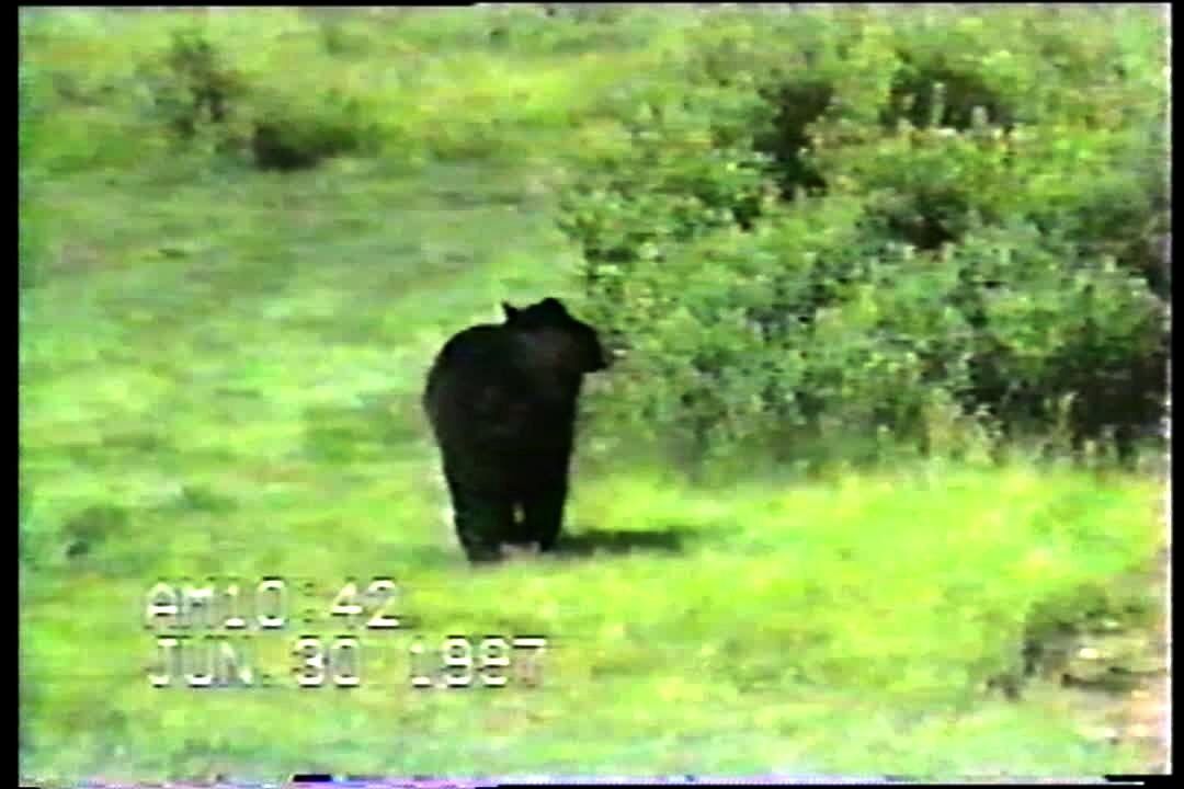 An adult black bear and its three cubs came up close to the cabin. The assembled guests taking photos of the bears until the mother bear starts to climb the porch and everyone scatters in fear.