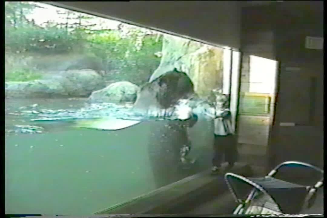 Woman films black bear from upper deck of house, bear suddenly lunges at her and growls loudly, family runs inside house. Wild Animal. Scare.