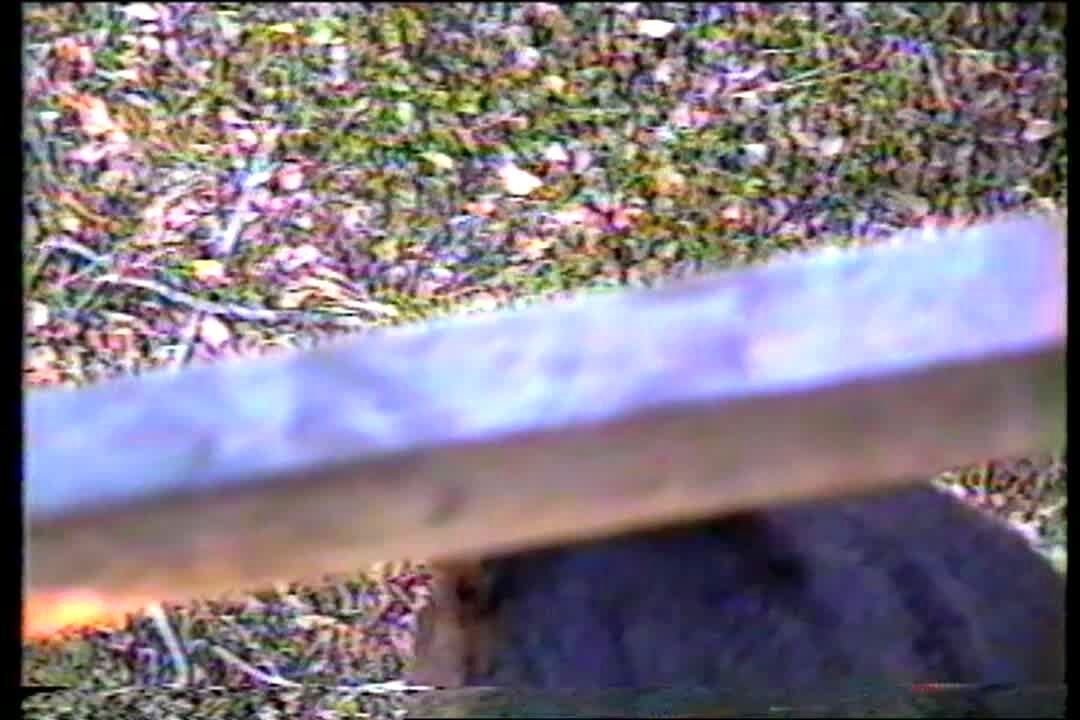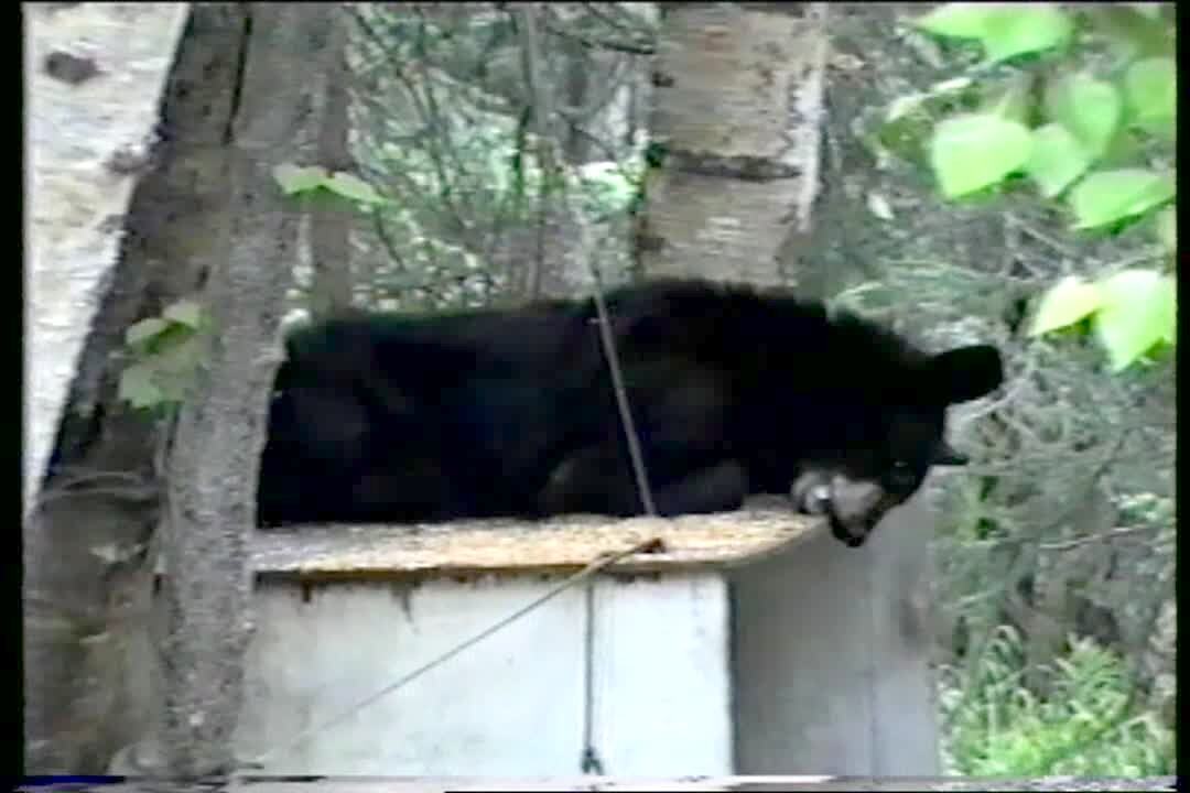 Young bear hangs from the porch roof to try and reach bird feeder. Bear eventually falls down when wood from roof breaks. Drops out of sight. No tails. Cabin, woods, forest.