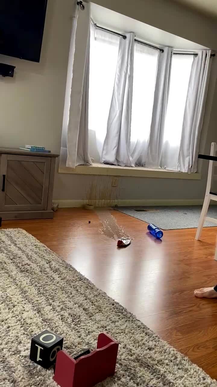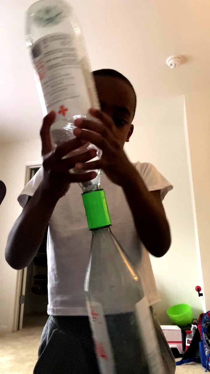 A young boy has two water bottles screwed together. He flips the bottles over and shakes them which creates a tornado. On his third time, the connector breaks, and all of the water spills on the floor. He stares forlornly at the spill and then the bottle. Break at :52.