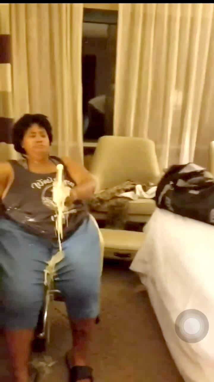 A woman falls asleep in a chair with a beer in her hand. A deaf man signs "She is KO" and yells in her ear. She wakes up and the beer bottle hits him in the face and the beer spills on her pants and they laugh.