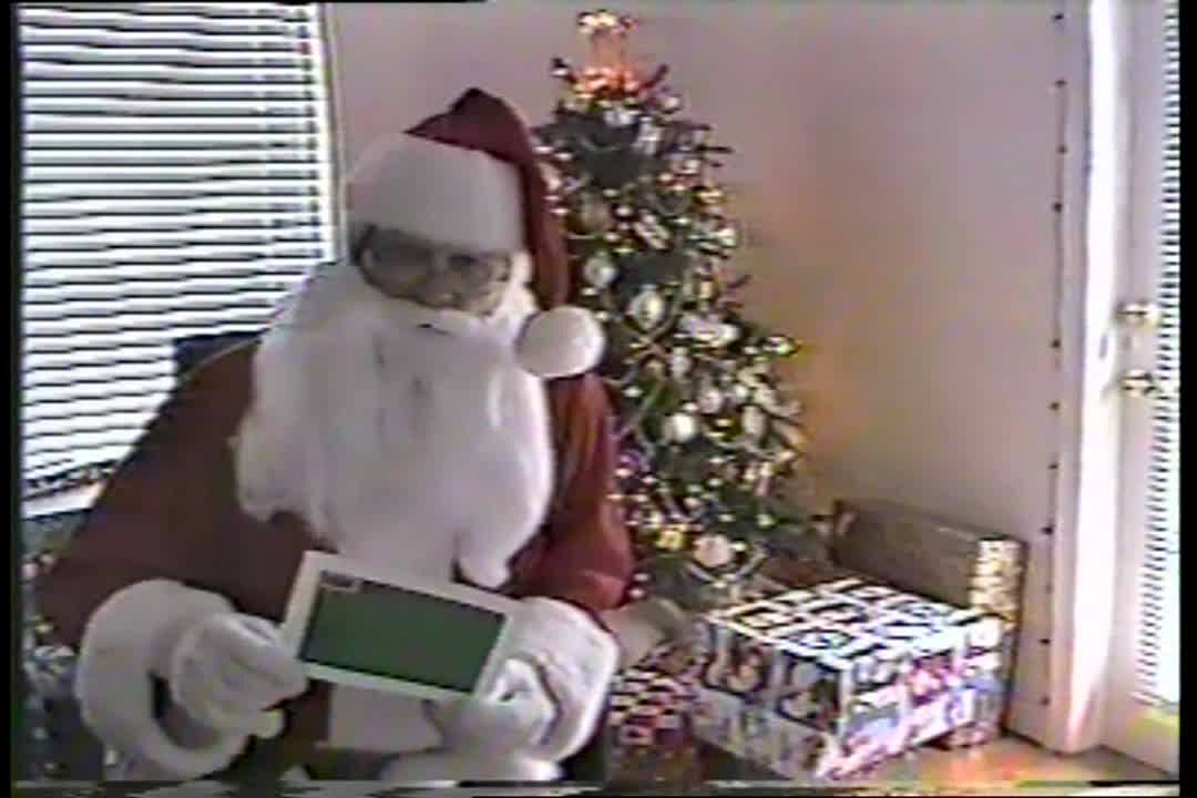 Man dressed as Santa Claus puts a gift under a tree. Reveals that he has no pants on.
