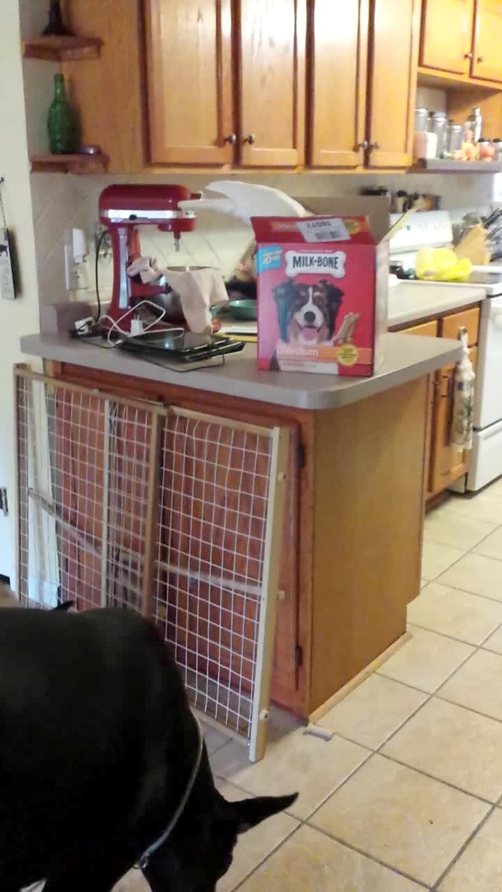 A Cockatoo bird pulls milk bone cookies out of a box and tosses them down to two Great Dane Dogs at home.
