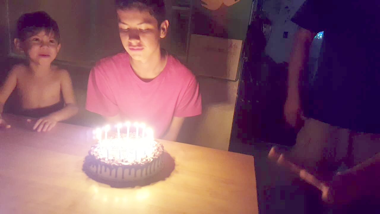A senior man struggles to cut his birthday cake in the kitchen because the cake is too rubbery and under-cooked. At 1:35, the man finds out that the cake is styrofoam and laughs really hard for a while. Everyone else stops, but he continues to laugh a little longer.