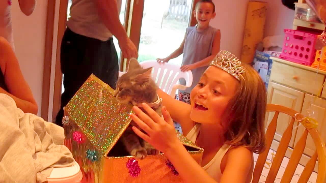 A young girl is scared when a kitten pops out of one of her birthday presents, but is quickly excited when she sees what it is indoors.