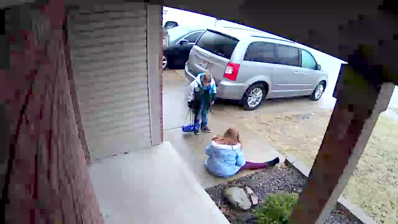 A young boy and his mom slip on black ice walking out their front door and then their dad does, too. Security camera.