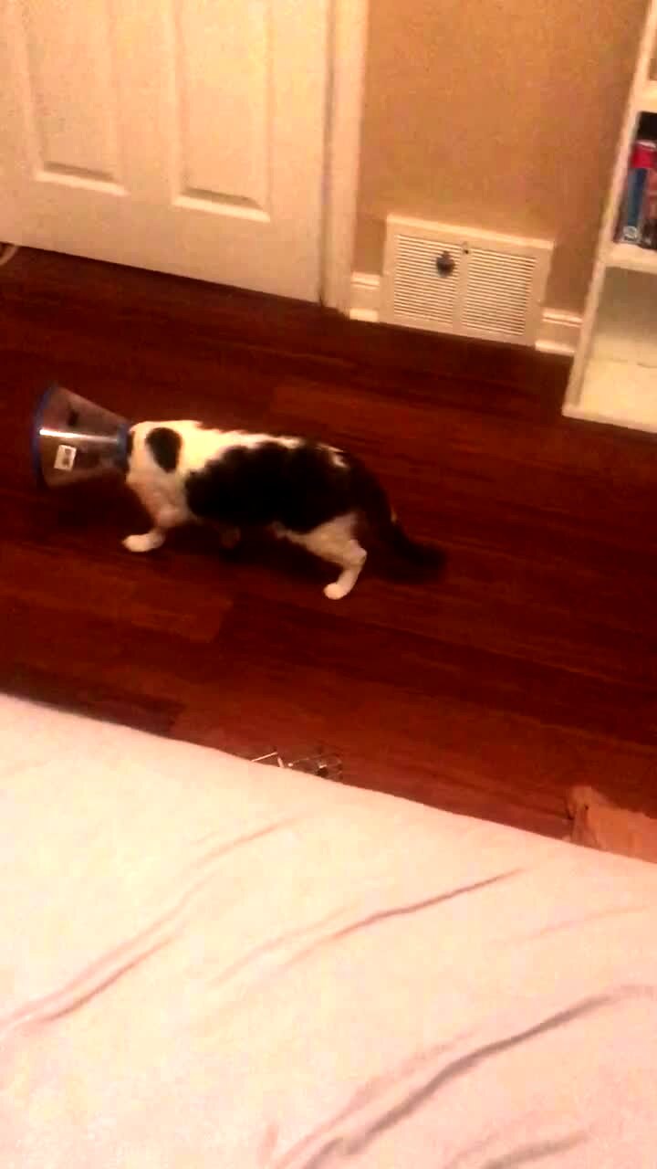 A fat orange cat chases a black cat through a cat door and gets stuck indoors.