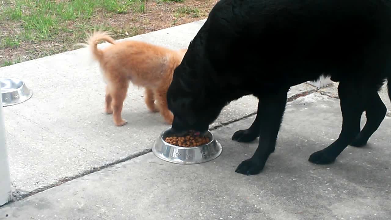 A black dog drops pieces of dog food on the ground repeatedly while eating for a small Pomeranian dog to eat outdoors.