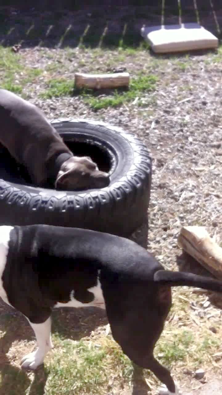 A Staffordshire Terrier dog outdoors grabs a large truck tire with its mouth and walks it across the yard. A black and white Staffordshire Terrier dog is visible.