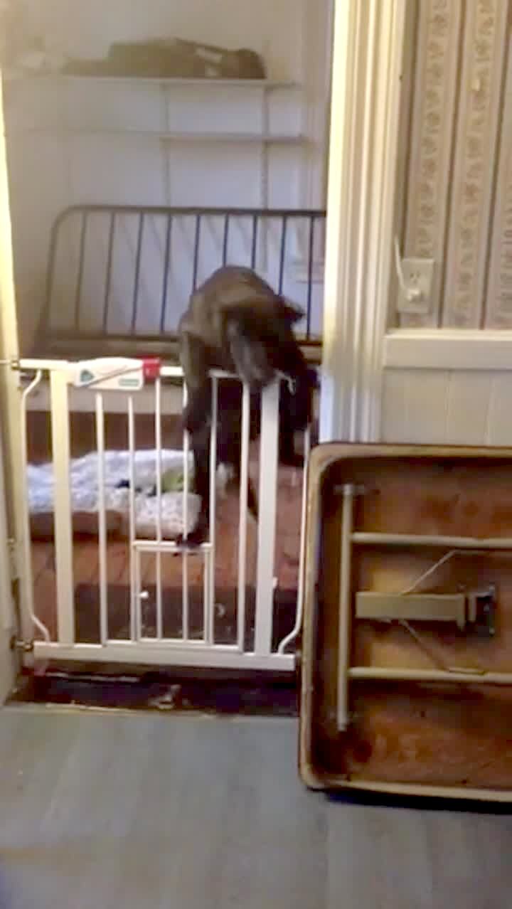 A black dog climbs over a baby gate indoors, it opens, and it falls down. Short tail.