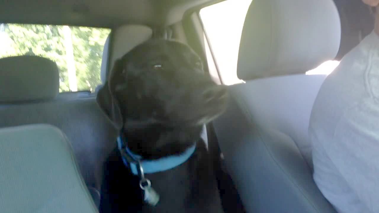 "Park-Bound Pooch" A black lab dog barks and whines excitedly in the car, licking its chops when a man asks if it wants to go to the park.
