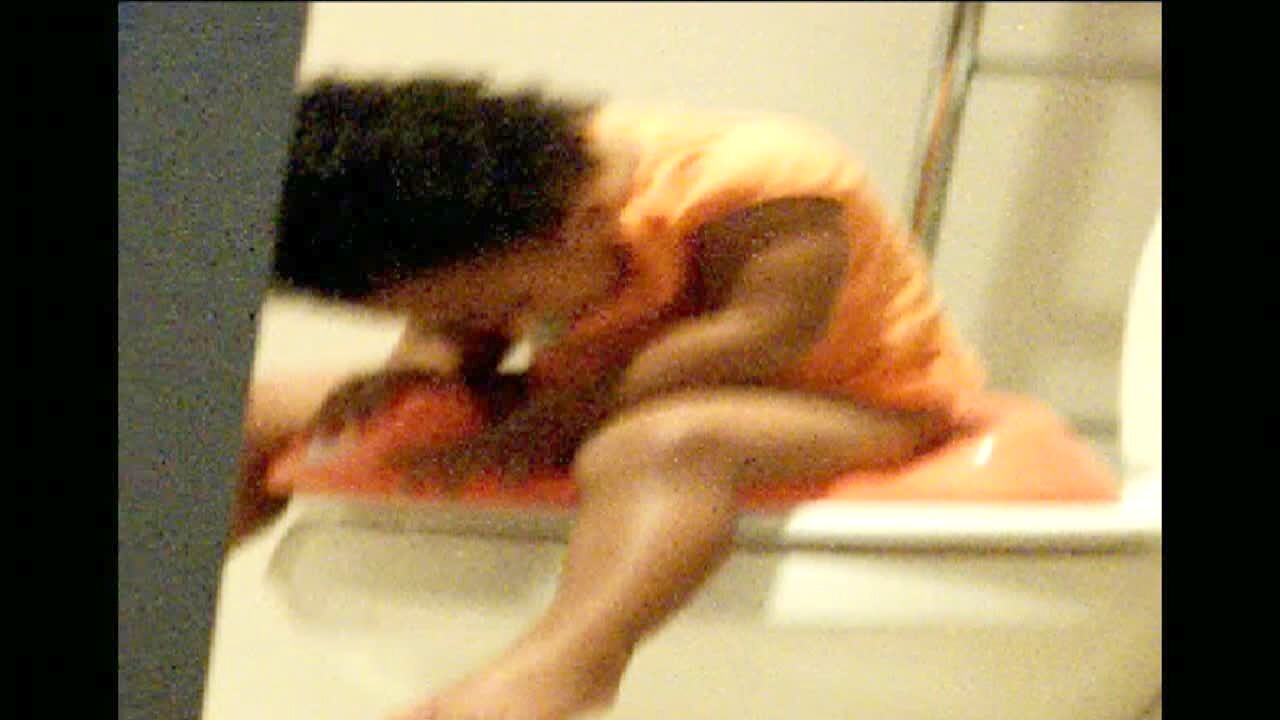A woman takes a baby into its crib. She lowers him to the mattress, but leans too far, and falls into the mattress herself. She then pushes herself out of the crib. Security camera footage.