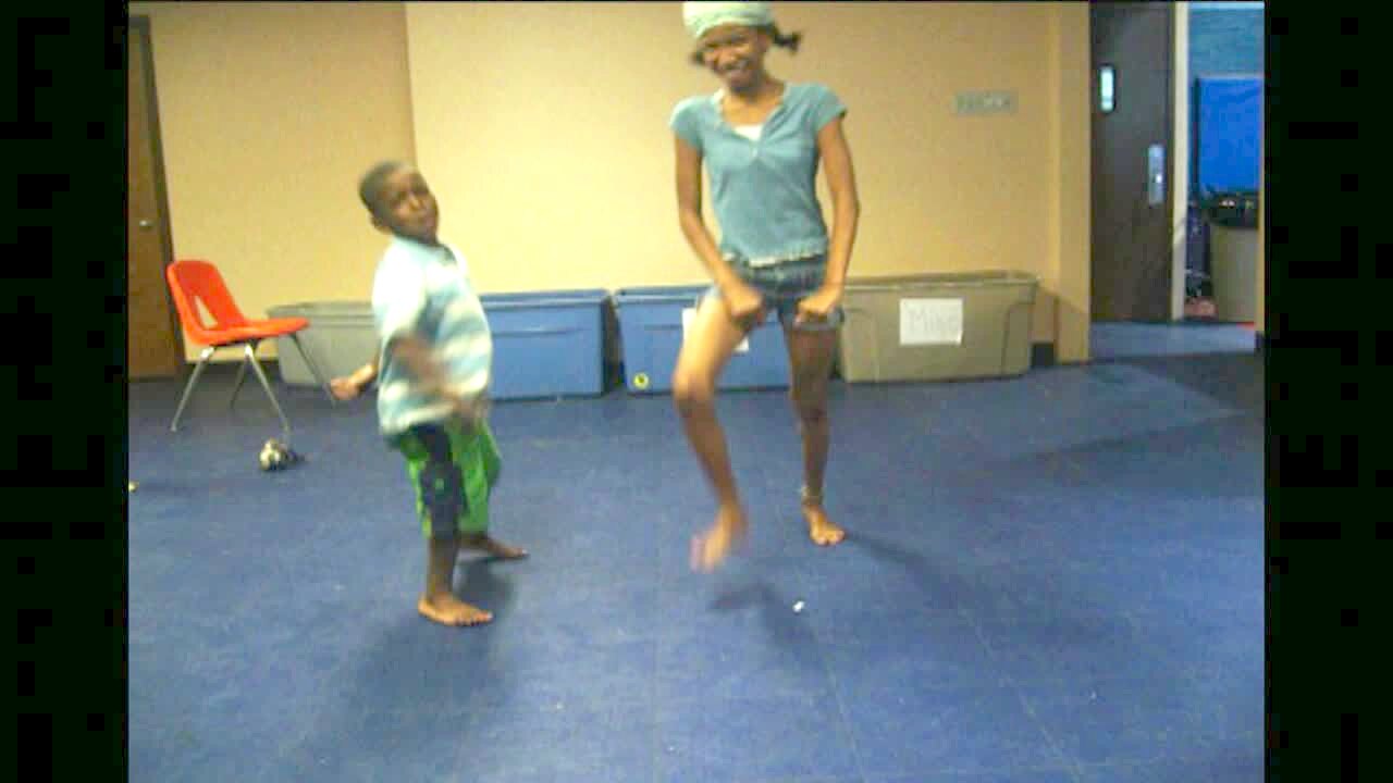 Teen girl does impression of a karate teacher & hits her head on her brother as he walks in front of her.