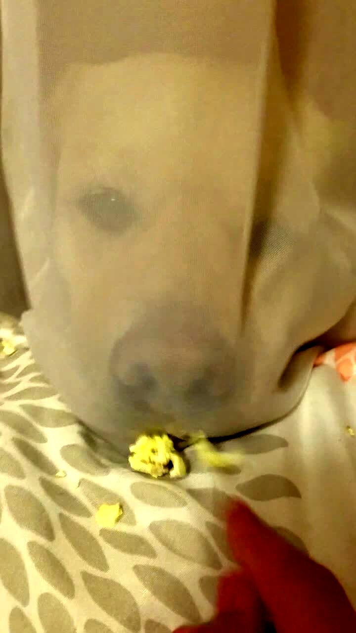 A Greyhound dog stares out a window indoors and looks over and under a woman's hand while she tries to block its view.