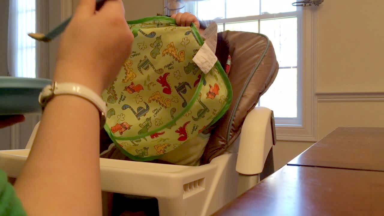 A baby boy in a highchair repeatedly blocks his face with his bib while his mom tries to feed him with a spoon.