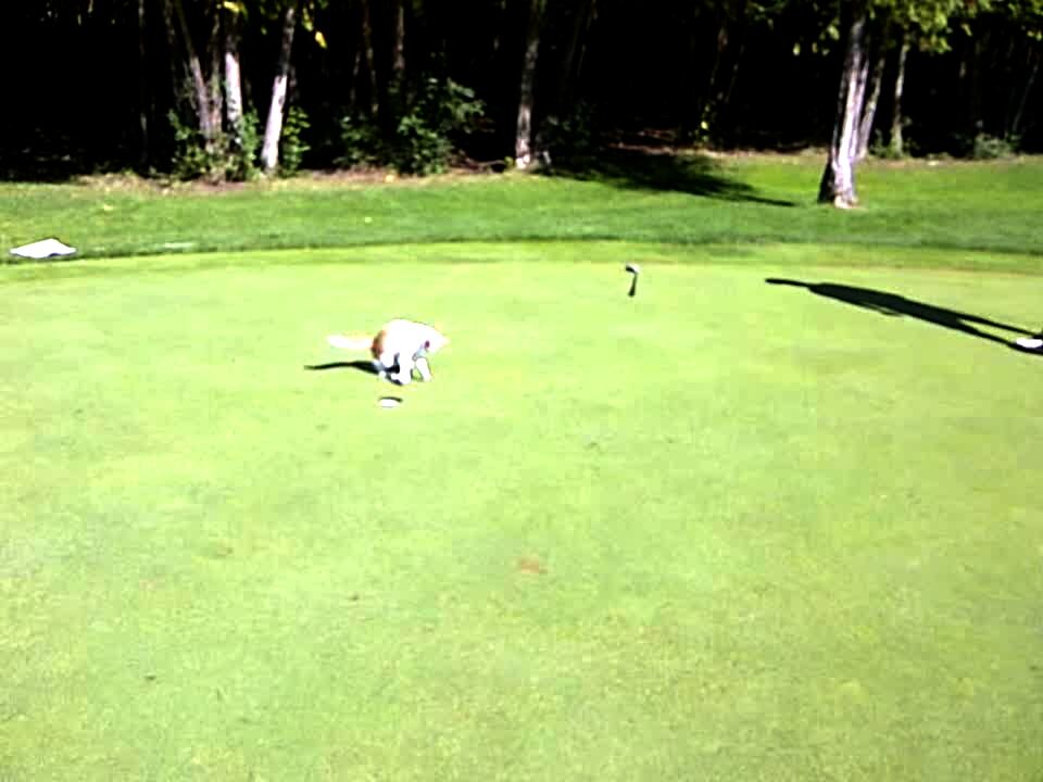 "Purr for the Course" Several men try to play golf on the putting green while a stray cat interferes.