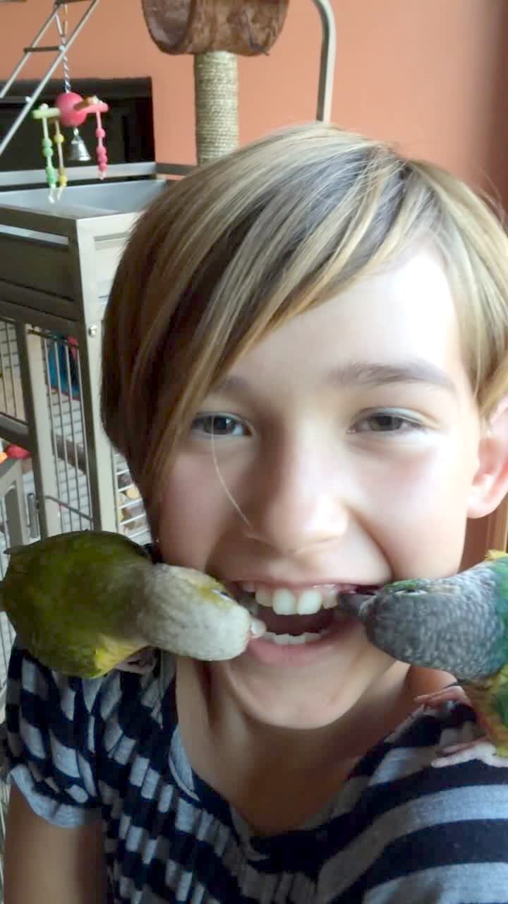 Two birds stand on a girl's shoulders indoors and clean her teeth when one of them grabs her loose tooth in its mouth and pulls it out.