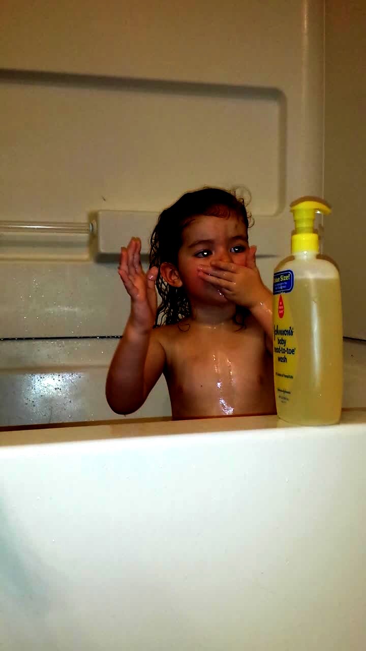 A tot girl in a bathtub indoors puts liquid soap on her face and blows bubbles out.