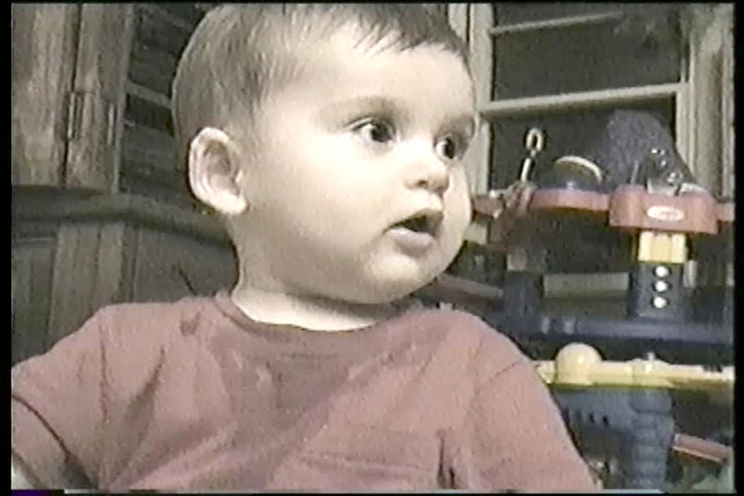 Tot boy cannot blow out candles on his cake. He tries. Man gives him lessons.