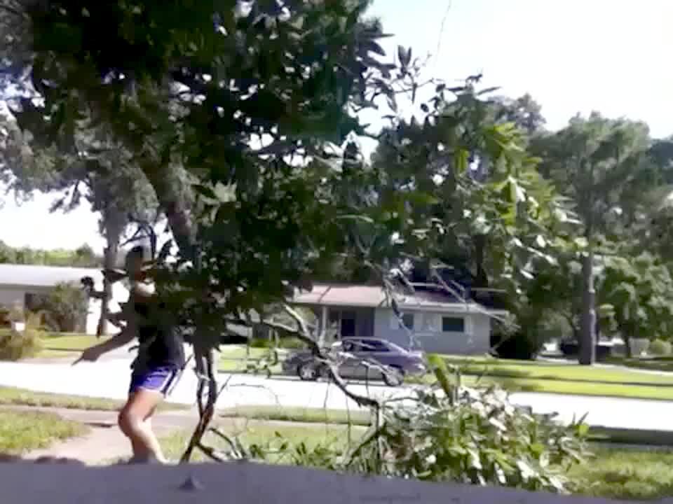 A man stands on a porch railing outdoors and cuts a branch from a tree. The branch falls and swings back, knocking the man over onto the porch.