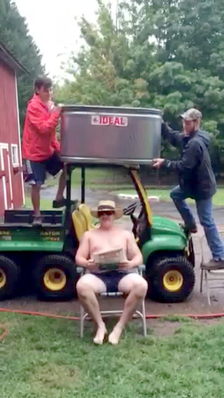 A man sits in a lawn chair outdoors and explains he's going to do an ice bucket challenge while a teen boy and a young man stand on a tractor behind him with a large metal tub of water. The man in the lawn chair pretends to read a newspaper as they struggle to tilt the tub of water, but when they do, it crushes the man and the camera cuts away but cuts back to show the man drenched on top of his broken lawn chair.