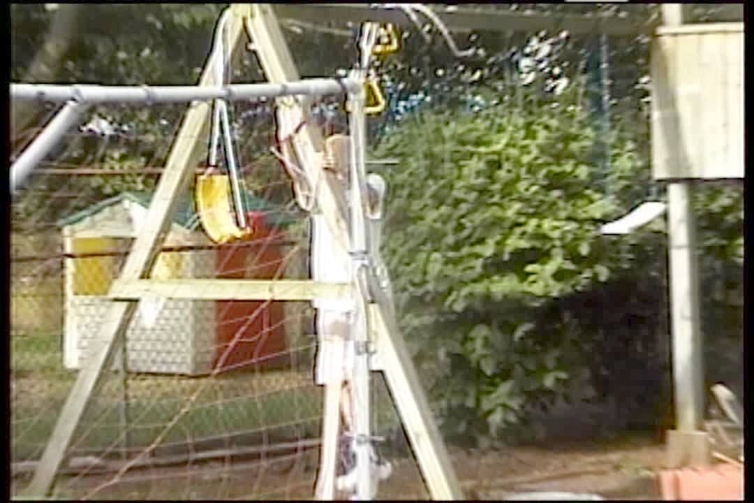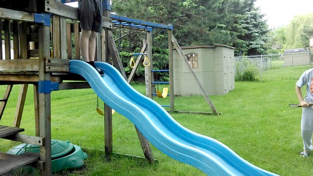 A man climbs into a water slide on a wooden frame outdoors and the frame collapses.