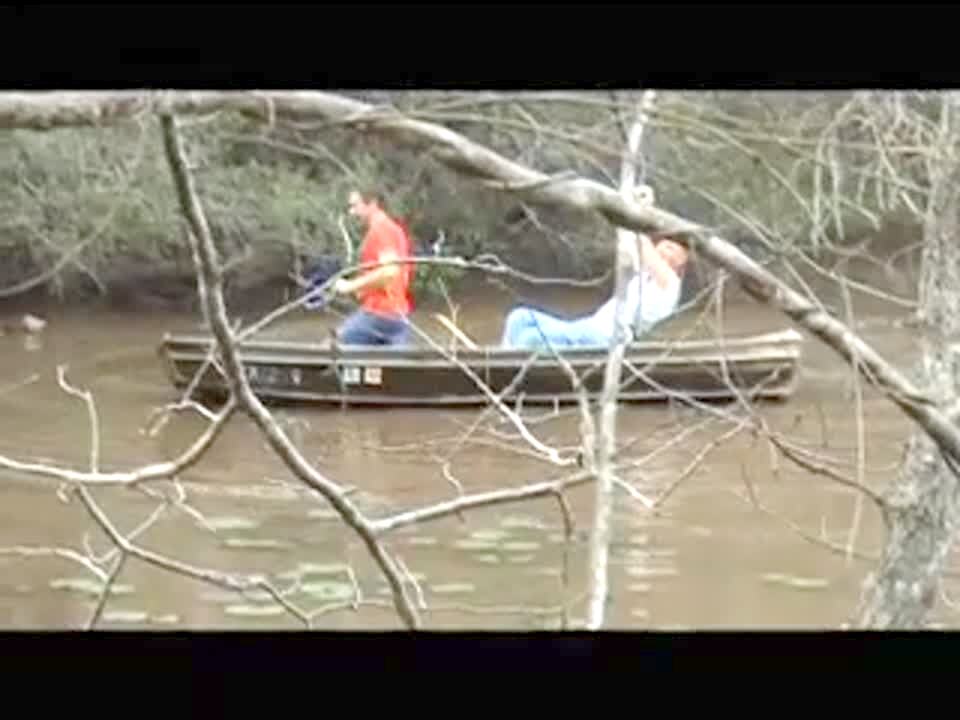 ATV pulls canoe through snow, pulls too hard and the canoe snaps in half. 2 kids are riding in the back.