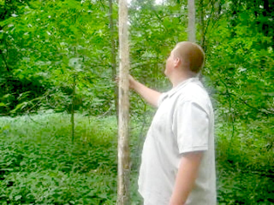 Two men hold either end of a long log and try to break it by running it into a tree. The log bounces back and hits both of them in the stomach.