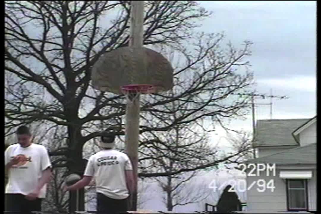 A teen boy shoots a basketball one handed outdoors, misses the hoop, and it lands on his phone/ camera. A young boy picks it up and says "Oh gosh."