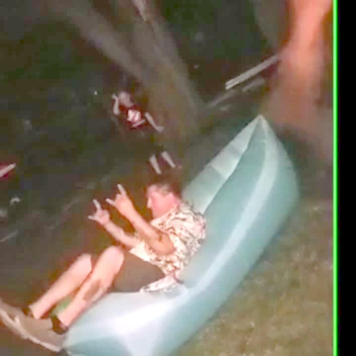 A diving board breaks when a man bounces on it and he falls in the swimming pool. Snapchat caption: Hahahhaa !!!!!!!