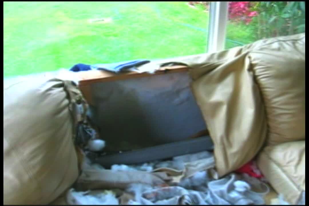 Security camera footage of a dog that sits on the porch and then jumps through the screen window and breaks it to get out into the driveway.