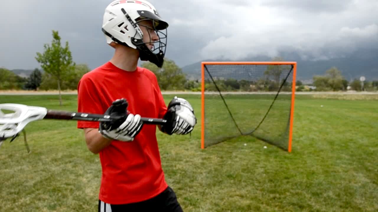 A teen boy throws a lacrosse ball at a goal outdoors, it bounces off the frame, and hits his brother recording him.